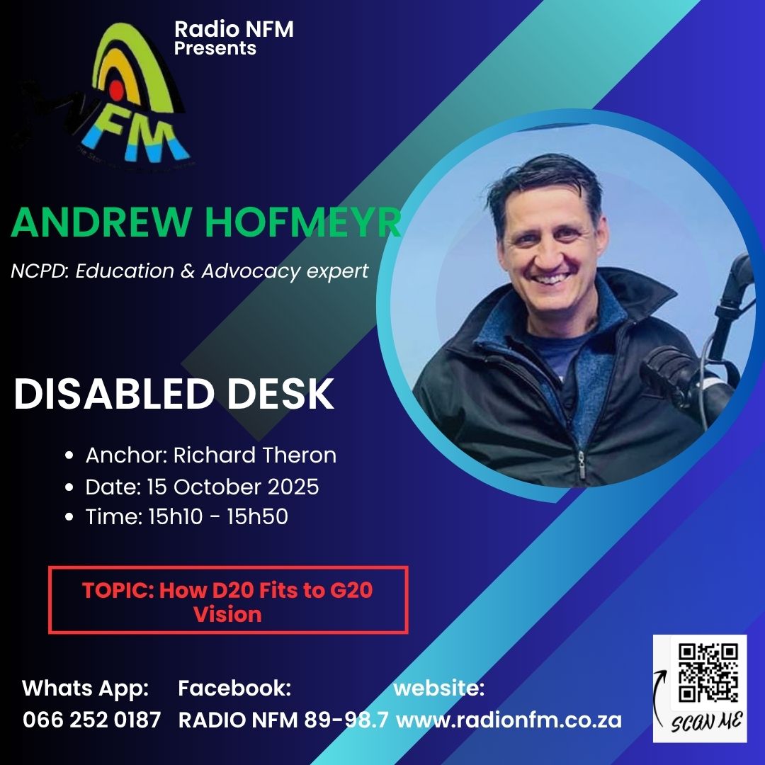 Lubabalo Mbeki joined SAFM’s Weekend Breakfast Show, produced by Zanele Mahatle, for a powerful conversation on the D20, the Disability Engagement Group to the G20. Representing the National Council of and for Persons with Disabilities (NCPD), Lubabalo highlighted South Africa’s leadership role in the global disability inclusion movement and the importance of ensuring that the voices of persons with disabilities are central to G20 policy discussions. The interview explored how the D20 aims to influence meaningful change ahead of the 2025 Summit.