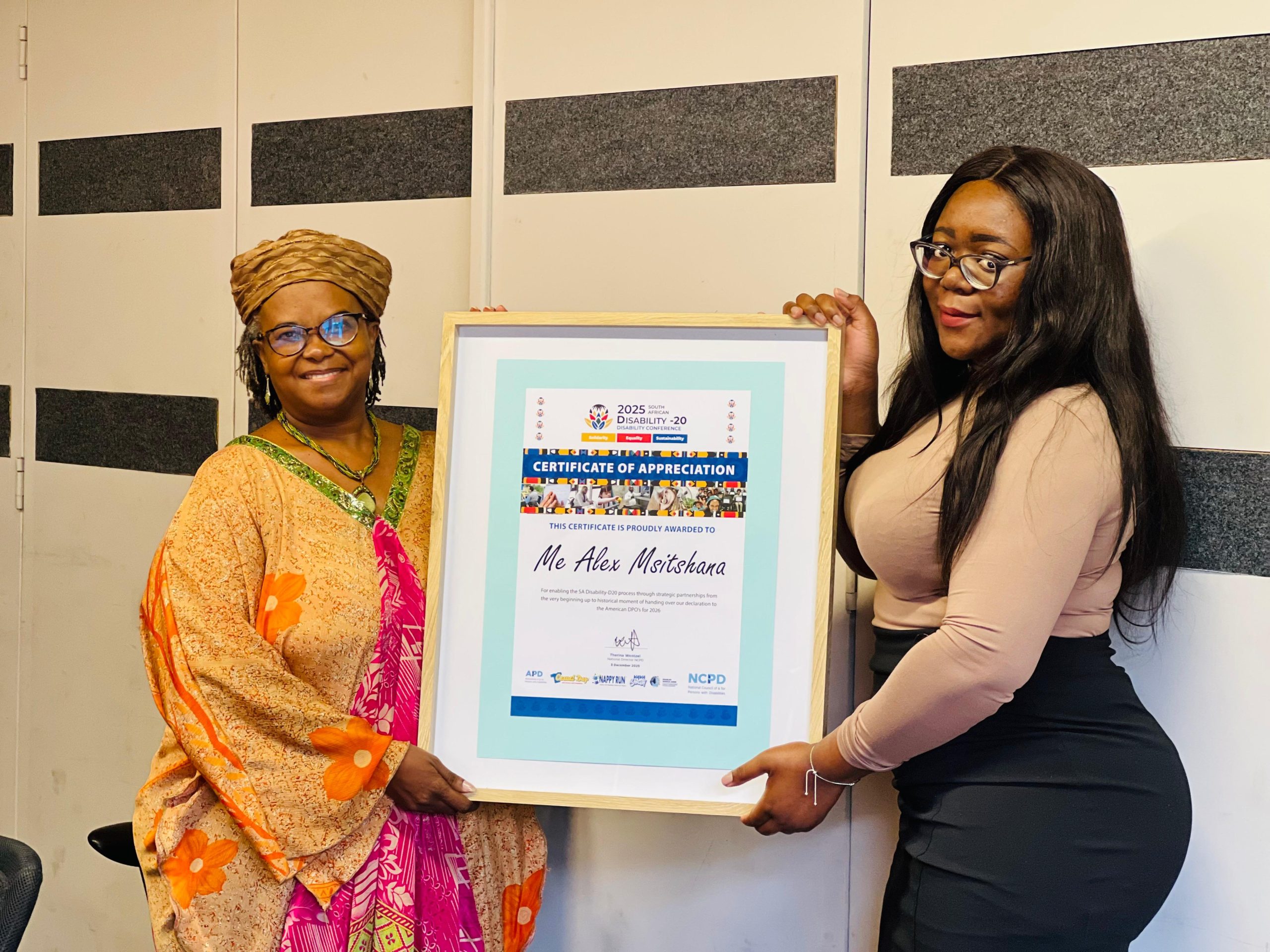 In an emotional and symbolic ceremony, the 2025 South African Disability-20 initiative was formally handed by Ms Alex Msitshana (NCPD Chairperson) to Marcie Roth as representative of the USA disability sector.