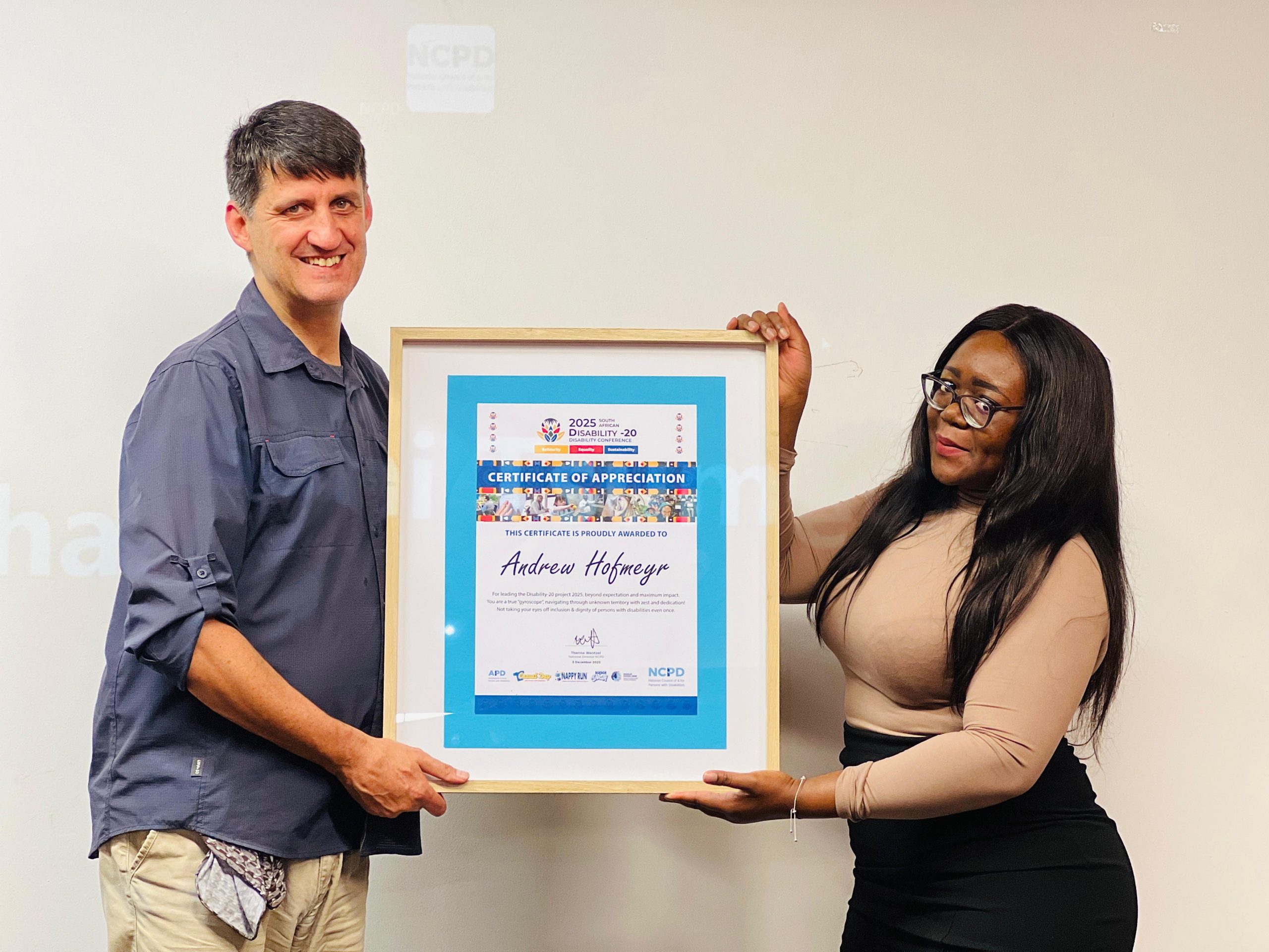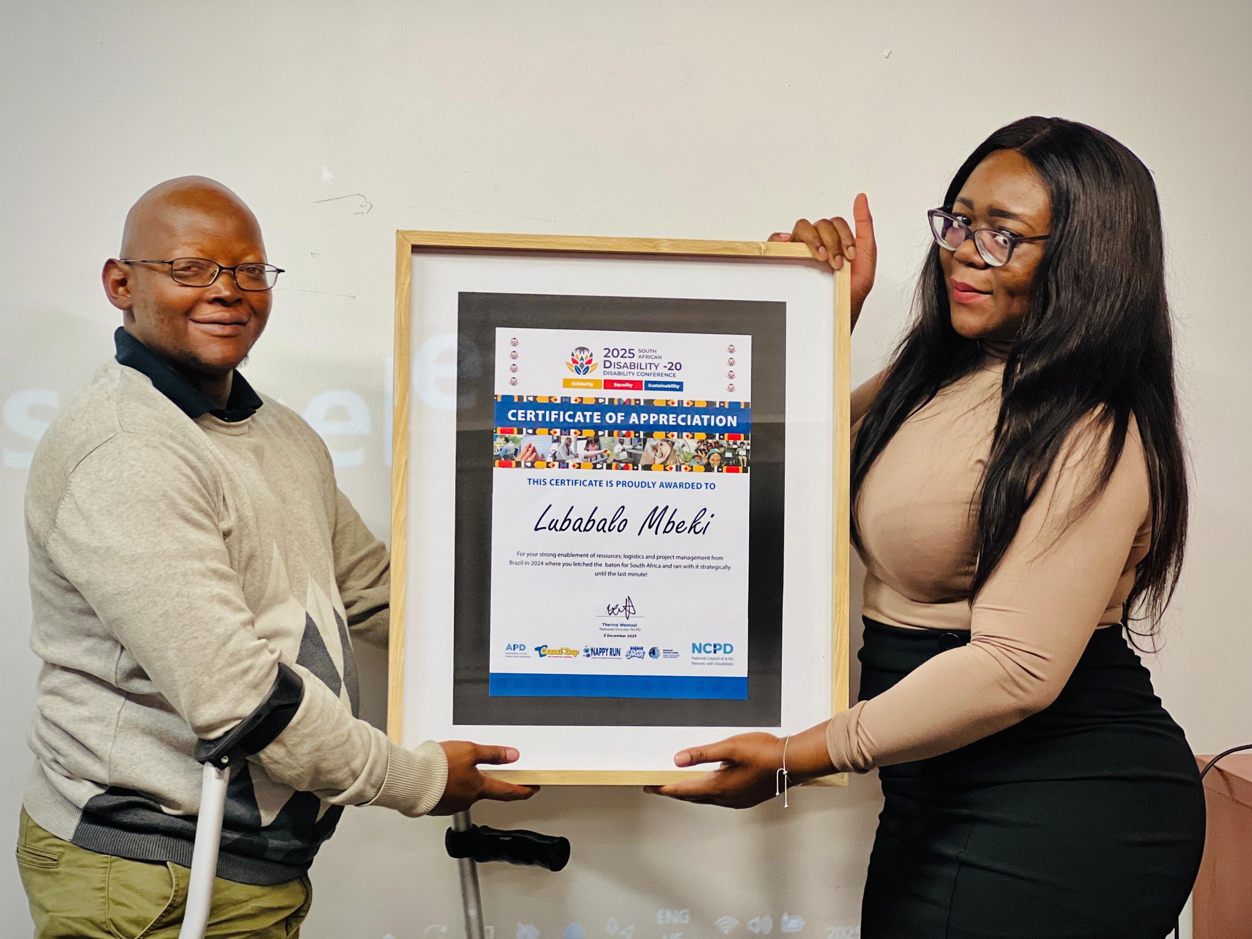 The NCPD Board and Executive Management proudly recognize the exceptional contributions of Andrew Hofmeyr, Alex Msitshana, and Lubabalo Mbeki in advancing the Disability-20 (D20) initiative. Andrew led the 2025 project with remarkable dedication and impact, navigating uncharted territory while keeping inclusion and dignity at the forefront. Alex played a pivotal role in enabling the South African D20 process through strategic partnerships, culminating in the historic handover of the declaration to the American DPOs for 2026. Lubabalo ensured seamless project management and resource enablement from Brazil in 2024, carrying the baton for South Africa with strategic focus and commitment until the final moment. Their leadership and dedication exemplify the spirit and mission of the NCPD.