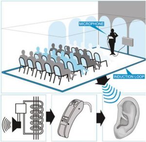 An induction loop system is a special type of sound system for use by people using hearing devices. The loop provides a magnetic, wireless signal that is picked up by the hearing aid when it is set to ‘T’ (Telecoil) setting.